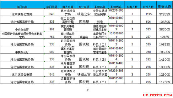 報名通過審核人數(shù)前十的職位主要集中在北京鐵路公安局、河北省國家稅務(wù)局、中央辦公廳等部門,具體信息如下:
