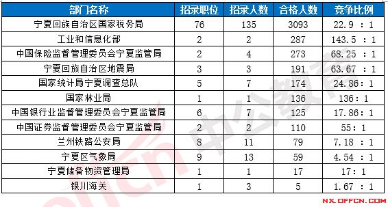 截至22日8時,據(jù)寧夏中公教育統(tǒng)計(jì),2017國考招錄職位中工作地點(diǎn)在寧夏的職位審核合格總?cè)藬?shù)為4549人,所有職位均有人報(bào)考,其中6職位競爭比低于面試比例,平均競爭比例為28.8:1 。