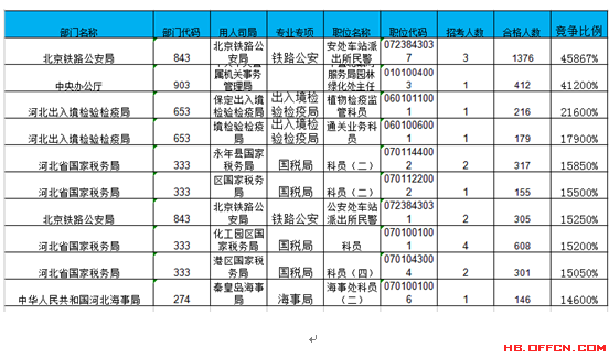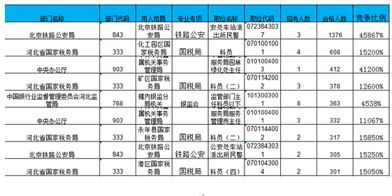 報名通過審核人數(shù)前十的職位主要集中在北京鐵路公安局、河北省國家稅務(wù)局、中央辦公廳等部門,具體信息如下:
