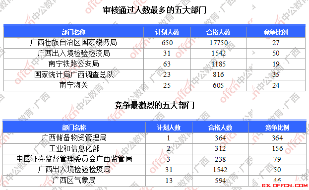 為幫助廣大考生更清晰的了解今日?qǐng)?bào)名情況,廣西中公教育整理了審核通過(guò)人數(shù)前五位的部門以及競(jìng)爭(zhēng)比例最激烈的五大部門,供廣大考生參考: