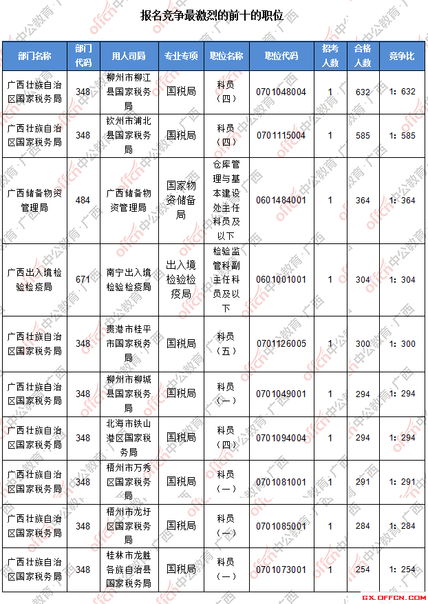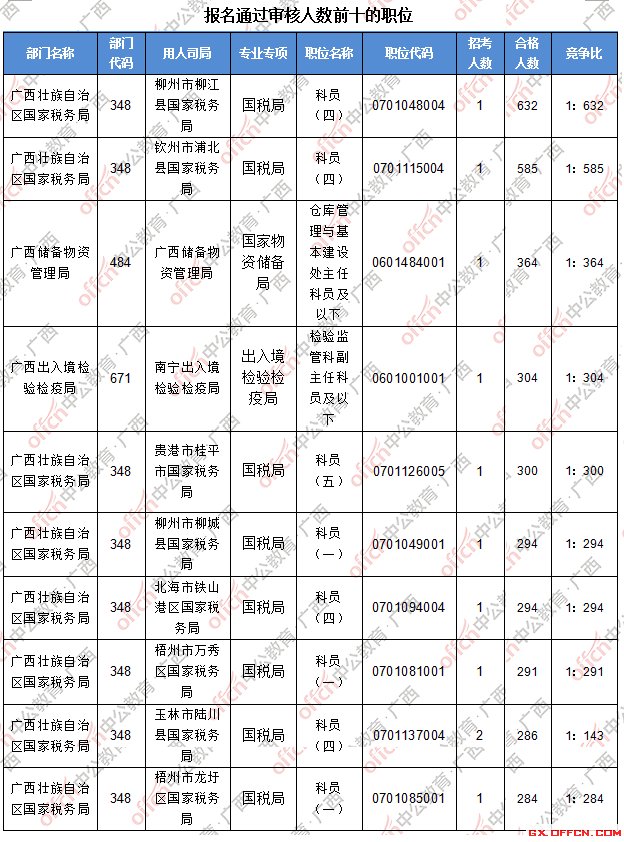 報(bào)名通過(guò)審核人數(shù)前十的職位主要集中在廣西壯族自治區(qū)國(guó)家稅務(wù)局、廣西儲(chǔ)備物資管理局、廣西出入境檢驗(yàn)檢疫局等部門,具體信息如下: