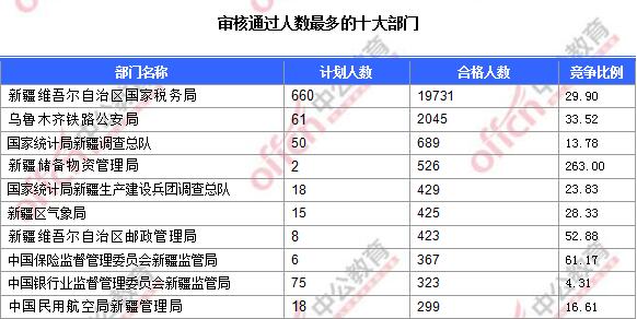 為幫助廣大考生更清晰的了解今日?qǐng)?bào)名情況,新疆中公教育整理了審核通過(guò)人數(shù)前十位的部門(mén)以及競(jìng)爭(zhēng)比例最激烈的十大部門(mén),供廣大考生參考:
