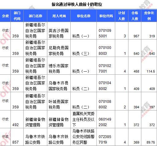 報(bào)名通過(guò)審核人數(shù)前十的職位主要集中在新疆維吾爾自治區(qū)國(guó)家稅務(wù)局、新疆儲(chǔ)備物資管理局、烏魯木齊鐵路公安局部門(mén),具體信息如下: