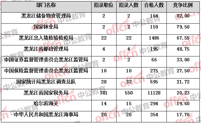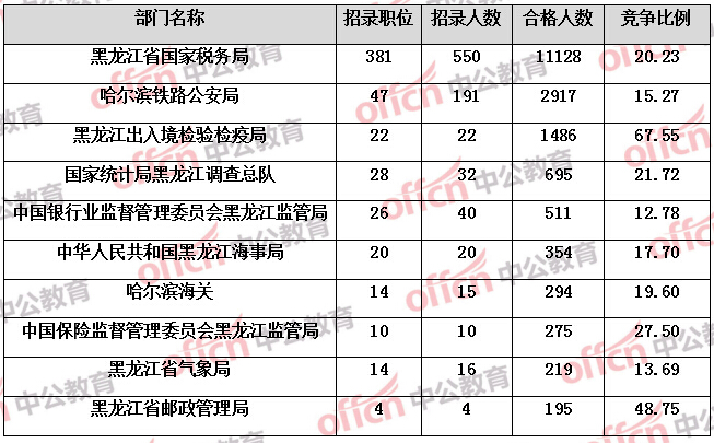 為幫助廣大考生更清晰的了解今日報(bào)名情況,黑龍江中公教育整理了審核通過人數(shù)前六位的部門以及競爭比例最激烈的十大部門,供廣大考生參考: