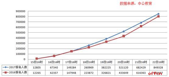 從圖表中數(shù)據(jù)來看,今年國考報名較去年更為,這已是一個不爭的事實,目前報名總人數(shù)達到849326人,超出去年同期近5萬人。公務員這類職位能同時兼具個人價值和社會理想,且福利待遇、社會更為全面,對于考生的吸引力一直保持高熱狀態(tài),引來無數(shù)考生為其競相“折腰”。