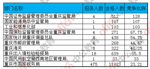 為幫助廣大考生更清晰的了解今日報(bào)名情況,重慶中公教育整理了審核通過人數(shù)前十位的部門以及競爭比例最激烈的十大部門,供廣大考生參考: