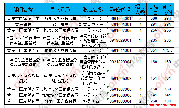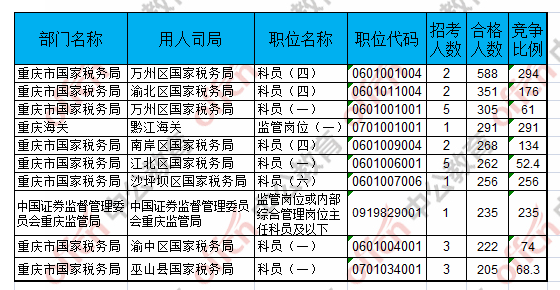 報(bào)名通過審核人數(shù)前十的職位主要集中在萬州區(qū)國家稅務(wù)局、渝北區(qū)國家稅務(wù)局、黔江海關(guān)等部門,具體信息如下: