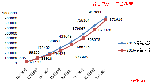 從2016國(guó)考報(bào)名跟2017國(guó)考報(bào)名對(duì)比走勢(shì)圖來(lái)看,今年報(bào)名總?cè)藬?shù)超去年已成定局,國(guó)考熱正在持續(xù)升溫。