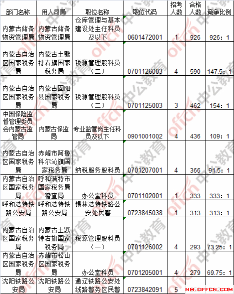 報(bào)名通過審核人數(shù)前十的職位主要集中在內(nèi)蒙古儲備物資管理局、內(nèi)蒙古土默特右旗國家稅務(wù)局、內(nèi)蒙古固陽縣國家稅務(wù)局等部門,具體信息如下: