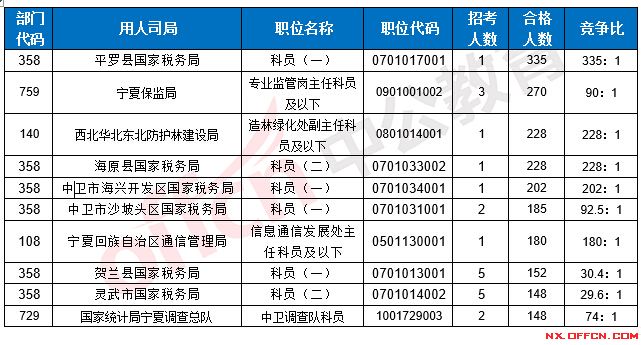 合格人數(shù)前十的職位主要集中在寧夏回族自治區(qū)國(guó)家稅務(wù)局、工業(yè)和信息化部、國(guó)家林業(yè)局等部門,具體信息如下: