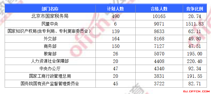 為幫助廣大考生更清晰的了解今日?qǐng)?bào)名情況,北京中公網(wǎng)校整理了合格人數(shù)前十位的部門以及競(jìng)爭(zhēng)比例最激烈的十大部門,供廣大考生參考: