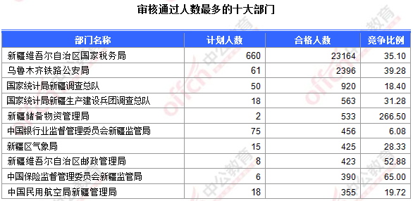 為幫助廣大考生更清晰的了解今日?qǐng)?bào)名情況,新疆中公網(wǎng)校整理了審核通過(guò)人數(shù)前十位的部門(mén)以及競(jìng)爭(zhēng)比例最激烈的十大部門(mén),供廣大考生參考: