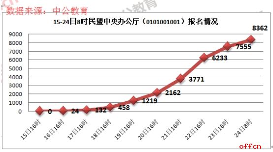 2017國考已進(jìn)入尾聲,民盟中央辦公廳接待處主任科員及以下(職位代碼為101001001)一職在19日摘得“雙冠”之后,以難以抵擋的“誘惑”,吸引這眾多考生的“蜂擁而至”,穩(wěn)居“人氣”的“頭把交椅”。截止到24日8時(shí),該職位報(bào)名合格人數(shù)已增至8362人,報(bào)名人數(shù)如此之多,令人咂舌,雖然錄取的幾率渺茫,但絲毫擋不住社會(huì)人員對此職位的“向往”,中公教育專家預(yù)計(jì),在報(bào)名最后一天中,此職位報(bào)考人數(shù)的數(shù)值絕不會(huì)停滯,而是會(huì)“勇往直前”,或可出現(xiàn)“井噴”。