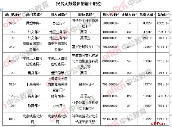 從報(bào)考人數(shù)上來看,截止24日8時(shí),34個(gè)職位已經(jīng)“破千”,其中,3個(gè)職位的報(bào)名人數(shù)已經(jīng)2000千,而外交部地區(qū)業(yè)務(wù)司英語一(職位代碼401001001)一職成為今年第二個(gè)了3000大關(guān)的職位;從競爭比上來說,除民盟中央辦公廳接待處主任科員及以下(職位代碼為101001001)一職位于難以企及的“八千挑一”的高峰之外,另外,還有8個(gè)職位是“千里挑一”的職位,這與去年同期相比,前十個(gè)職位競爭比都在1107:1之上相較,今年報(bào)考“冷熱兩重天”的特點(diǎn)異常顯著,中公教育專家提醒考生,在選擇職位準(zhǔn)備“下手”時(shí),一定要保持頭腦清醒,切勿盲目跟風(fēng)。