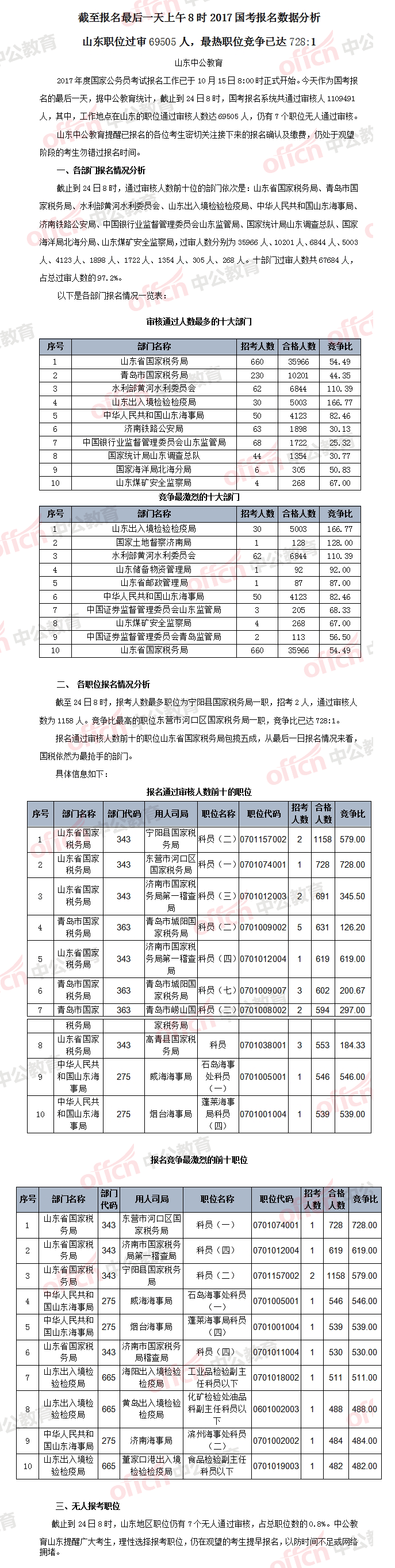 【截至24日8時(shí)】2017國考報(bào)名山東職位過審69505人,最熱職位競爭已達(dá)728:1