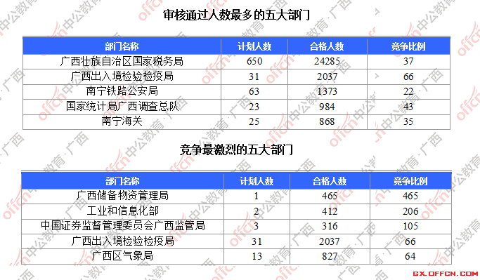 為幫助廣大考生更清晰的了解今日報名情況,廣西中公網校整理了審核通過人數前五位的部門以及競爭比例最激烈的五大部門,供廣大考生參考:
