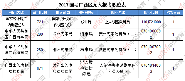 截止到24日8時,工作地點在廣西的職位共有4個無人報考,僅占全部職位的0.6%。下面是部分廣西無人報考職位一覽表,廣西中公網校專家建議廣大考生結合自身條件,根據自己的實際情況找到屬于自己的職位,避免激烈競爭。