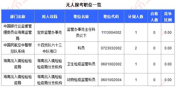 截止到24日8時,工作地點在海南的職位共有4個無人報考。海南中公網(wǎng)校提醒廣大考生,報名最后一天,能選人少的盡量選擇!