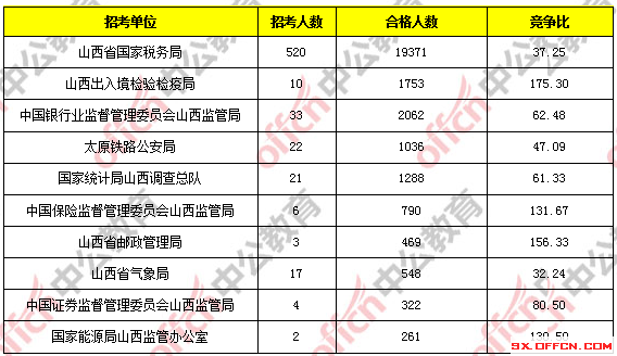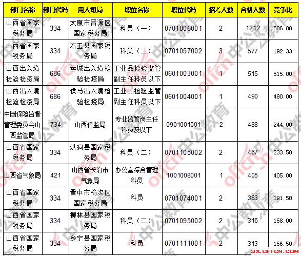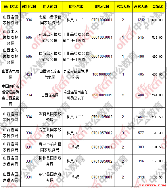 報考人數(shù)前十的職位主要集中在山西省國家稅務(wù)局、山西出入境檢驗檢疫局這兩個部門,具體信息如下: