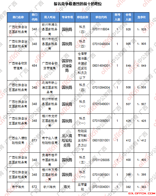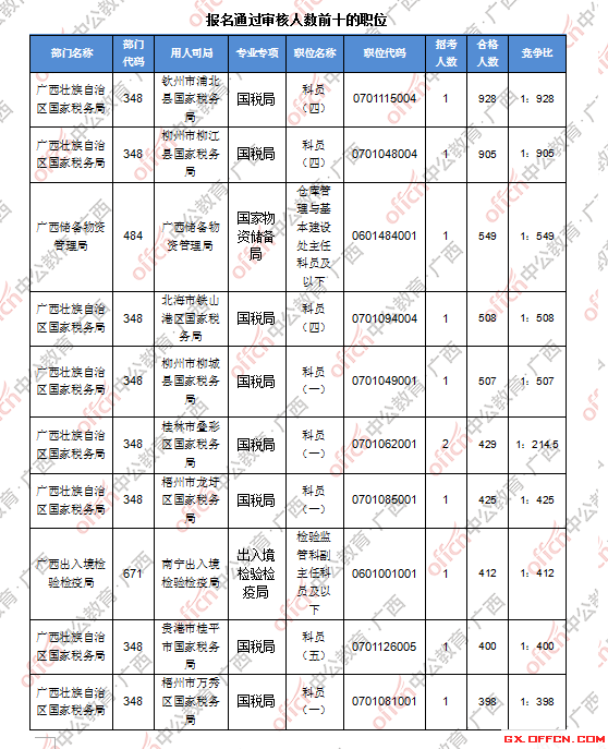 報(bào)名通過(guò)審核人數(shù)前十的職位主要集中在廣西壯族自治區(qū)國(guó)家稅務(wù)局、廣西儲(chǔ)備物資管理局、廣西出入境檢驗(yàn)檢疫局等部門,具體信息如下:
