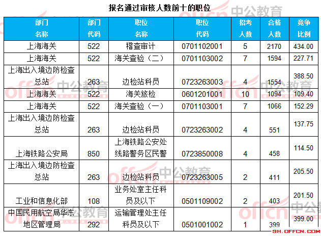 報名通過審核人數(shù)前十的職位主要集中在上海海關(guān)、上海出入境邊防檢查總站、上海鐵路公安局,具體信息如下: