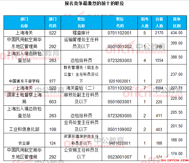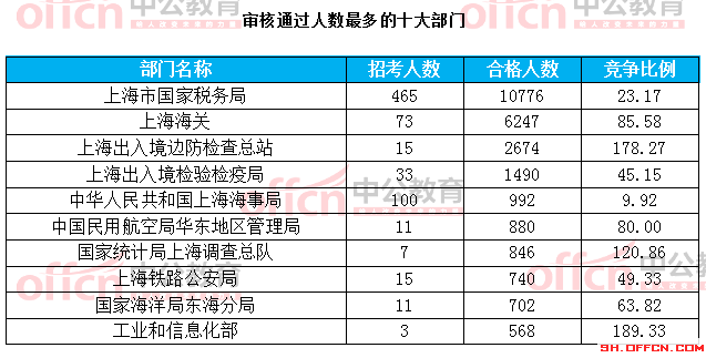 為幫助廣大考生更清晰的了解今日報名情況,上海中公網(wǎng)校整理了審核通過人數(shù)前十位的部門以及競爭比例最激烈的十大部門,供廣大考生參考: