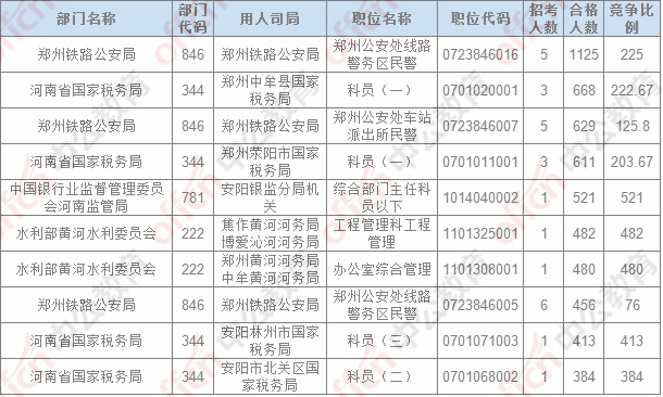 報名通過審核人數(shù)排名前列的職位主要集中在鄭州鐵路公安局、河南省國家稅務局,中國銀行業(yè)監(jiān)督管理委員會河南監(jiān)管局,具體信息如下: