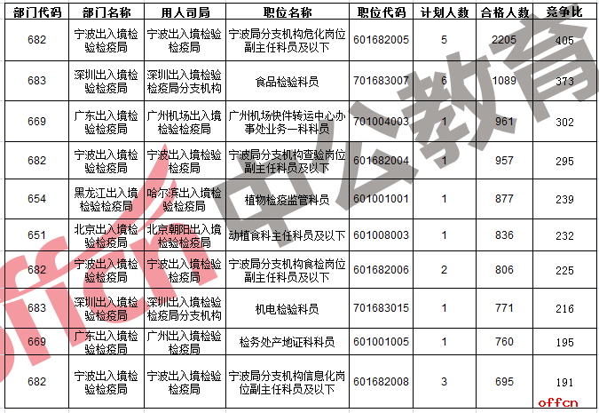 2017國考出入境檢驗檢疫系統(tǒng)32個部門共提供759個職位,招錄899人。截至24日17:30,總報名審核通過人數(shù)為81694人,競爭比例為90.87:1,仍有39個職位無人報考,其余所有職位均有人通過審核。下面是中公網(wǎng)校統(tǒng)計的出入境檢驗檢疫系統(tǒng)報名情況,供考生參考: