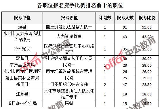 競(jìng)爭熱門招考單位,前三位依次是:藍(lán)山縣森林公安局(競(jìng)爭比例25:1)、道縣森林公安局(競(jìng)爭比例15:1)和永州市人力資源和社會(huì)局(競(jìng)爭比例14:1)、民盟永州市委(競(jìng)爭比例14:1)。