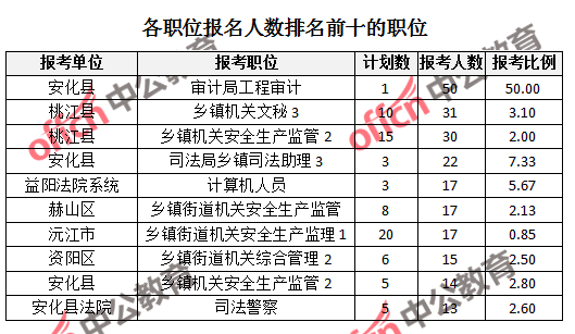 為幫助廣大考生更清晰的了解報(bào)名情況,中公教育整理了益陽(yáng)市各職位的報(bào)名人數(shù)排名以及競(jìng)爭(zhēng)比例排名,供廣大考生參考: