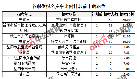 競(jìng)爭(zhēng)熱門職位,前三位依次是:安化縣審計(jì)局工程審計(jì)(競(jìng)爭(zhēng)比例50:1)、益陽(yáng)市城市管理行政執(zhí)法局直屬四大隊(duì)市容管理1(競(jìng)爭(zhēng)比例11:1)和資陽(yáng)區(qū)教育局基建(競(jìng)爭(zhēng)比例11:1)以及沅江市人民檢察院計(jì)算機(jī)(競(jìng)爭(zhēng)比例11:1)、安化縣殘疾人聯(lián)合會(huì)綜合管理(競(jìng)爭(zhēng)比例10:1)。