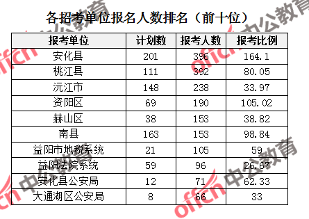 競爭熱門招考單位,前三位依次是:安化縣(競爭比例164.1:1)、資陽區(qū)(競爭比例105.02:1)、南縣(競爭比例98.84:1)。