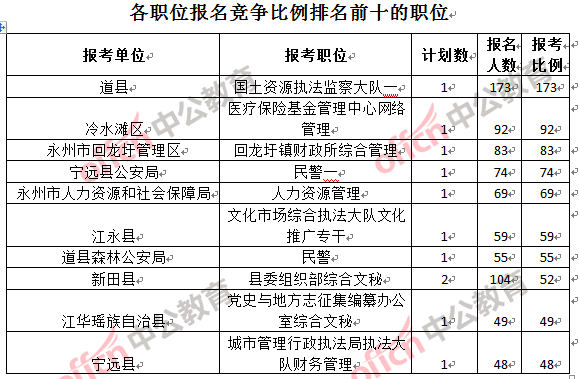 為幫助廣大考生更清晰的了解報(bào)名情況,中公教育整理了永州各職位的報(bào)名人數(shù)排名以及競爭比例排名,供廣大考生參考: