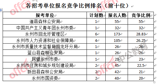競爭熱門招考單位,前三位依次是:道縣森林公安局(競爭比例55:1)、中國共產(chǎn)主義青年團(tuán)永州市委(競爭比例32:1)和永州市回龍圩管理區(qū)(競爭比例28.83:1)。