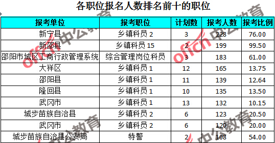為幫助廣大考生更清晰的了解報名情況,中公教育整理了湖南邵陽各職位的報名人數(shù)排名以及競爭比例排名,供廣大考生參考: