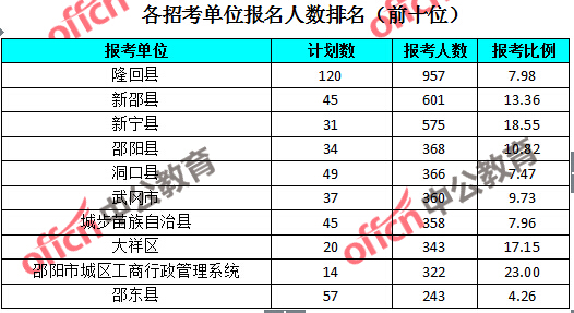 為幫助廣大考生更清晰的了解報名情況,中公教育整理了湖南邵陽各招考單位的報名人數(shù)排名以及競爭比例排名,供廣大考生參考: