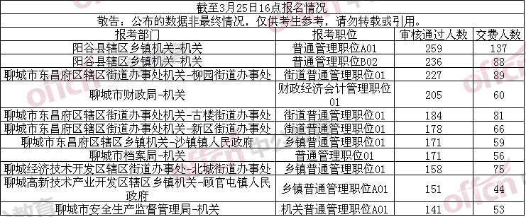 審核通過人數(shù)最多的職位仍為陽谷縣轄區(qū)鄉(xiāng)鎮(zhèn)機關,通過人數(shù)增長為259人,本職位要求本科學歷,其他條件不限。其他審核通過人數(shù)較多的職位集中在東昌府區(qū)轄區(qū)鄉(xiāng)鎮(zhèn)機關或者街道辦事處,開發(fā)區(qū)和市直部分職位人數(shù)激增,進入前十。