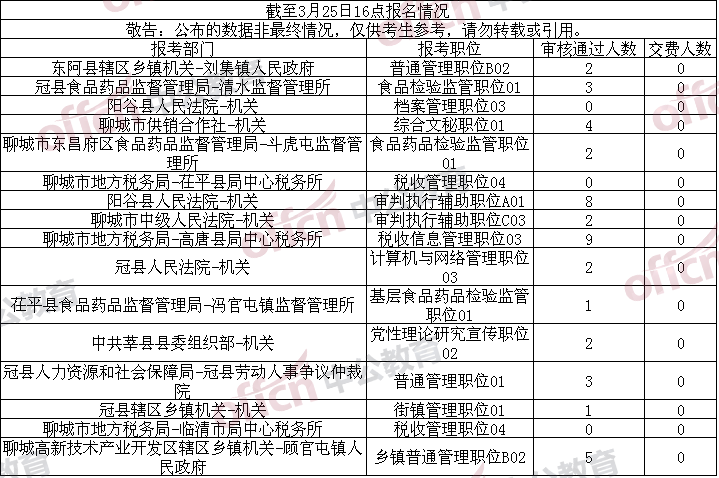 從第三日報名人數(shù)情況來看,過審人數(shù)8449,比昨日3840,增長120%。但截至3月25日16:00即報名第三日下午,仍有3個職位審核通過人數(shù)為0,16個職位繳費人數(shù)為0。