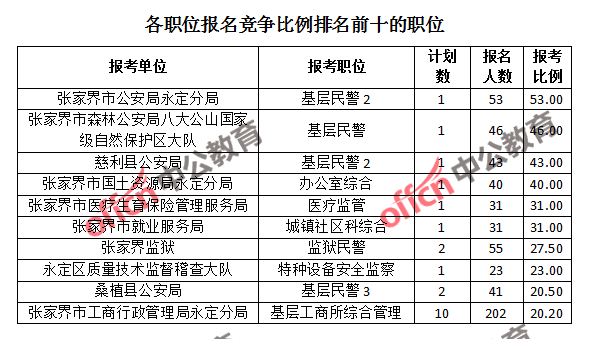 競爭熱門職位,前三位依次是:張家界市公安局永定分局基層民警2(競爭比例53:1)、張家界市森林公安局八大公山自然保護(hù)區(qū)大隊基層民警(競爭比例46:1)和慈利縣公安局基層民警2(競爭比例43:1)。