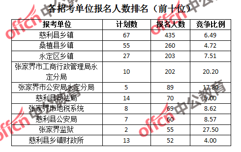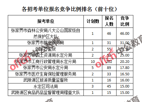 競爭熱門招考單位,前三位依次是:張家界市森林公安局八大公山自然保護(hù)區(qū)大隊(競爭比例46:1)、張家界市就業(yè)服務(wù)局(競爭比例31:1)和張家界監(jiān)獄(競爭比例27.5:1)。