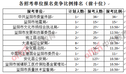 競(jìng)爭(zhēng)熱門(mén)招考單位,前三位依次是:中共益陽(yáng)市委宣傳部(競(jìng)爭(zhēng)比例34:1)、益陽(yáng)市地震局(競(jìng)爭(zhēng)比例15:1)和益陽(yáng)市文化市場(chǎng)綜合執(zhí)法局(競(jìng)爭(zhēng)比例13.5:1)。