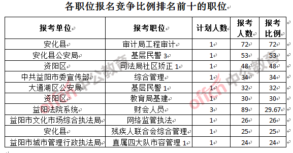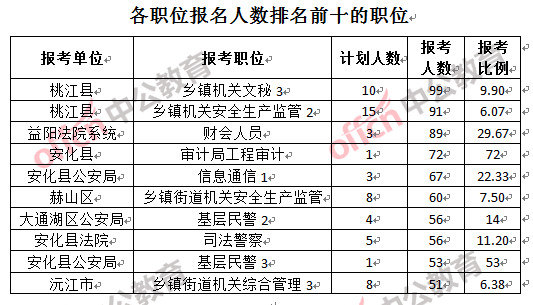 競(jìng)爭(zhēng)最熱門(mén)職位,前三位依次是:安化縣審計(jì)局工程審計(jì)(競(jìng)爭(zhēng)比例72:1)、安化縣公安局基層民警3(競(jìng)爭(zhēng)比例53:1)和資陽(yáng)區(qū)司法局社區(qū)矯正1(競(jìng)爭(zhēng)比例48:1)。