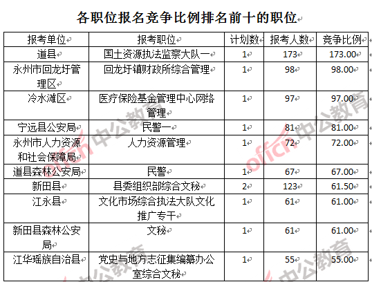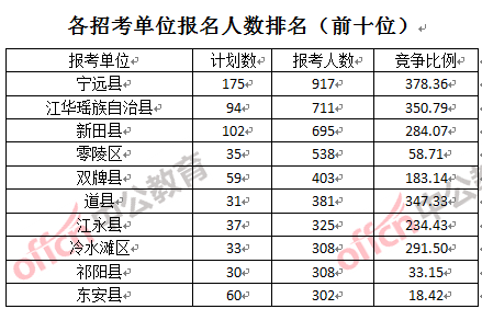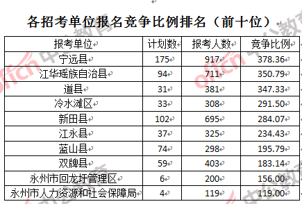 競爭熱門招考單位,前三位依次是:寧遠縣(競爭比例378:1)、江華瑤族自治縣(競爭比例350:1)和道縣(競爭比例347:1)。