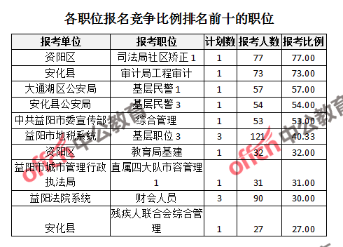 競(jìng)爭(zhēng)熱門(mén)職位,前三位依次是:資陽(yáng)區(qū)司法局社區(qū)矯正1(競(jìng)爭(zhēng)比例77:1)、安化縣審計(jì)局工程審計(jì)(競(jìng)爭(zhēng)比例73:1)、大通湖區(qū)公安局基層民警1(競(jìng)爭(zhēng)比例57:1)。