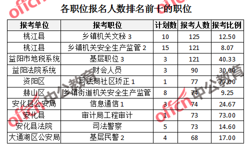 截止26日17時(shí),2017年益陽(yáng)公務(wù)員報(bào)名人數(shù)最多的前三個(gè)職位為桃江縣鄉(xiāng)鎮(zhèn)機(jī)關(guān)文秘3(125人報(bào)名)、桃江縣鄉(xiāng)鎮(zhèn)機(jī)關(guān)安全生產(chǎn)監(jiān)管2(121人報(bào)名)和益陽(yáng)市地稅系統(tǒng)基層職位3(121人報(bào)名)、益陽(yáng)法院系統(tǒng)財(cái)會(huì)人員(90人報(bào)名)。