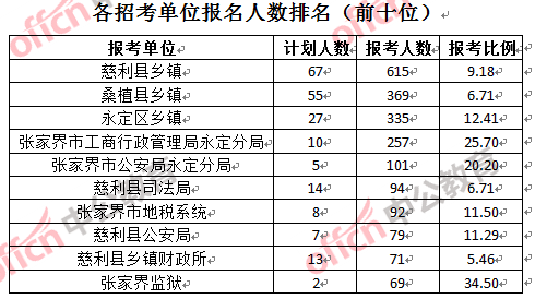 為幫助廣大考生更清晰的了解報名情況,中公網(wǎng)校整理了張家界市各招考單位的報名人數(shù)排名以及競爭比例排名,供廣大考生參考: