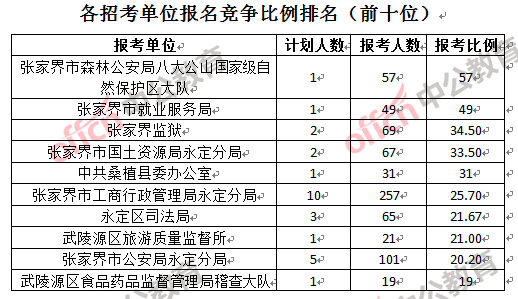 競爭熱門招考單位,前三位依次是:張家界市森林公安局八大公山自然保護(hù)區(qū)大隊(duì)(競爭比例57:1)、張家界市就業(yè)服務(wù)局(競爭比例49:1)和張家界監(jiān)獄(競爭比例34.5:1)。