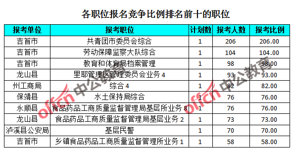 為幫助廣大考生更清晰的了解報(bào)名情況,中公網(wǎng)校整理了湖南湘西各職位的報(bào)名人數(shù)排名以及競(jìng)爭(zhēng)比例排名,供廣大考生參考: