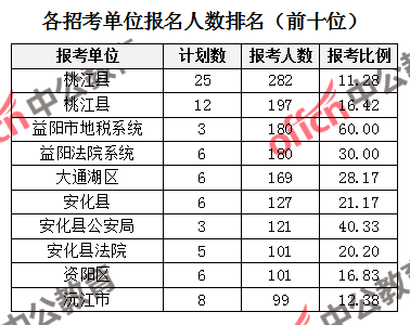 為幫助廣大考生更清晰的了解報名情況,中公網(wǎng)校整理了益陽市各招考單位的報名人數(shù)排名以及競爭比例排名,供廣大考生參考: