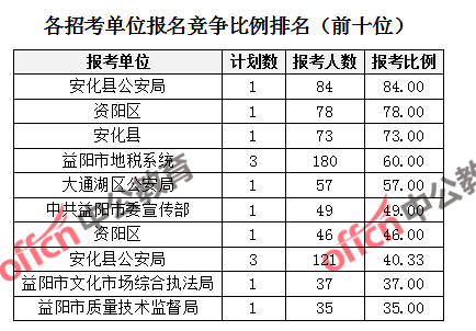 競爭熱門招考單位,前三位依次是:安化縣公安局(競爭比例84:1)、資陽區(qū)(競爭比例78:1)、安化縣(競爭比例73:1)。